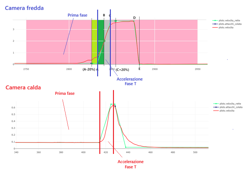 Per capire meglio cosa ti sto dicendo, osserva con attenzione le curve di iniezione che ti ho riportato di seguito e guarda l’escursione della curva di velocità (quella in rosso) durante il ciclo di riempimento dello stampo.